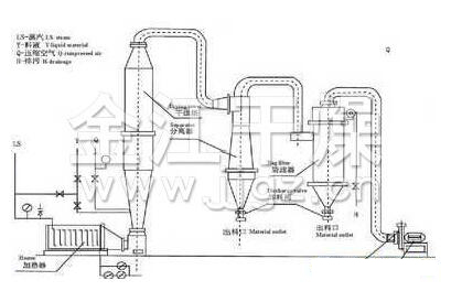 將壓縮空氣或者是水蒸汽用≥300m/s的速度從噴嘴噴出,靠氣液兩者間的速度差產(chǎn)生的摩擦力,使液料分離成細(xì)小的霧滴。霧滴與熱空氣的充分接觸并經(jīng)行熱交換,在10-30秒內(nèi)迅速完成整個(gè)干燥過(guò)程。